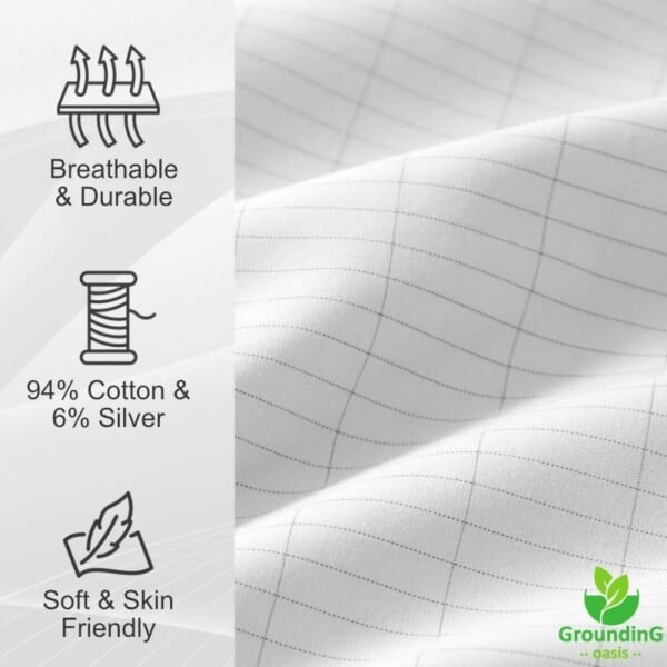This grounding pillowcase is crafted with a high-quality blend of organic cotton and conductive silver fibers, providing exceptional softness and antimicrobial properties. Silver is known for its ability to neutralize free radicals, reduce bacteria, and help maintain a clean, hygienic surface for you to sleep on. The silver threads woven into the fabric ensure effective grounding, allowing your body to connect to the earth’s natural energy while you sleep.